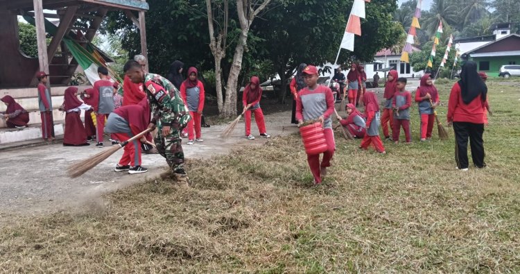 Pasangkayu, - Kegiatan kerja bakti kembali digelar di Dusun Randomayang 1, Desa Randomayang, Kecamatan Bambalamotu, Kabupaten Pasangkayu. Aksi bersih lingkungan ini melibatkan Babinsa Koramil 1427-02/Bbmt Sertu Marzuki bersama para siswa siswi dari SDN Randomayang dan SMKN 1 Bambalamotu.
