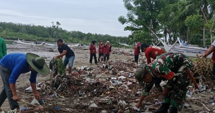 Di lokasi, tampak Babinsa bersama puluhan warga dan mahasiswa bergotong royong mengumpulkan sampah yang berserakan di sepanjang garis pantai. Dibantu peralatan sederhana seperti cangkul dan karung, aksi pembersihan dilakukan menyusuri area yang terdampak paling banyak oleh sampah kiriman.