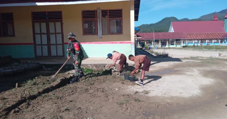 Mamasa, - Dalam upaya menanamkan kesadaran menjaga kebersihan lingkungan sejak dini, Babinsa Koramil 04/Pana, Sertu Nurdin, mengajak para siswa melaksanakan kegiatan gotong royong membersihkan lingkungan sekolah di Kelurahan Nosu Kecamatan Nosu Kabupaten Mamasa, Kamis (06/11/2025)