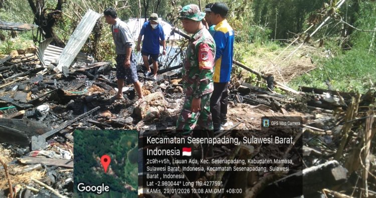 Mamasa, - Babinsa Koramil 1428-01/Mamasa Serda Eldris Endek mendatangi lokasi kebakaran rumah salah satu warga bertempat di Desa Lisuan Ada Kecamatan Sespa Kabupaten Mamasa, Kamis (29/01/2026)