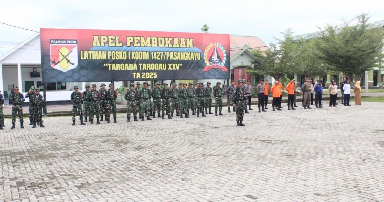 PASANGKAYU — Kodim 1427/Pasangkayu resmi memulai pelaksanaan Latihan Posko I “Taroada Tarogau XXV” Tahun 2025, yang dibuka langsung oleh Danrem 142/Tatag Brigjen TNI Hartono, S.I.P., M.M, di Lapangan Apel Makodim 1427/Pasangkayu, Jl. Dewi Sartika. Kegiatan yang diikuti sekitar 50 orang tersebut menjadi momentum penting dalam meningkatkan kesiapsiagaan satuan kewilayahan menghadapi potensi bencana, khususnya banjir yang kerap melanda wilayah Kabupaten Pasangkayu. Selasa (18/11/2025).