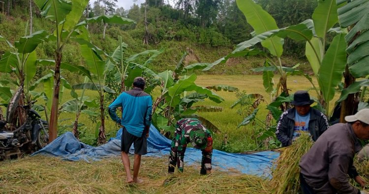 Mamasa, - Babinsa Koramil 1428-01/Mamasa Praka Syahril melaksanakan kegiatan membantu masyarakat gotong royong panen padi di Dusun Kama Desa Bubun Batu Sumarorong Kecamatan Mamasa kabupaten Mamasa, Rabu (07/01/2026)