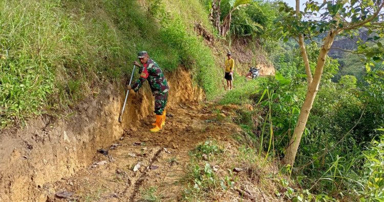 Mamasa, - Babinsa Koramil 1428-03/Mambi bersama warga melaksanakan Gotong royong pembersihan Jalan Tani sehingga petani nyaman menggunakan jalan tersebut di Desa Saludurian kecamatan Mambi kabupaten Mamasa, Senin (26/01/2026)