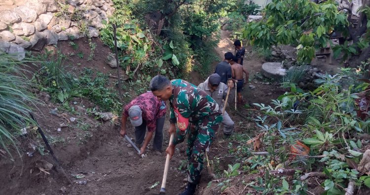 Babinsa tampak terjun langsung bersama warga, bahu-membahu menggali dan merapikan saluran air di medan yang cukup curam. Kehadiran Babinsa di tengah masyarakat tidak hanya memberi semangat, tetapi juga memperkuat kebersamaan serta kepedulian terhadap lingkungan tempat tinggal.